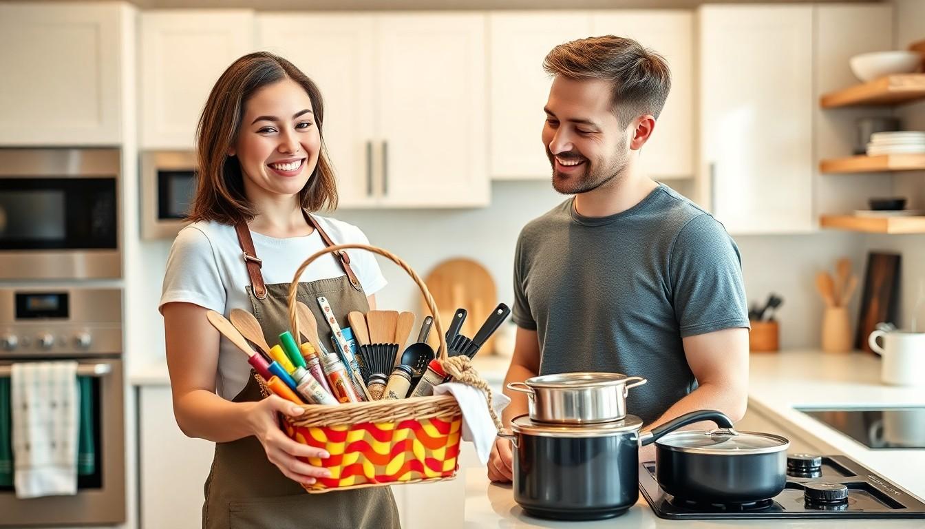 Kitchen essentials simplify cooking and meal preparation. Quality knives provide durability and efficiency. Essential cookware sets include pots and pans that match various cooking styles. Consider adding a stylish cutting board for practicality and aesthetics. High-quality kitchen gadgets like peelers, graters, and measuring cups enhance culinary experiences. Gift baskets filled with spices, oils, or specialty ingredients inspire creativity in meal preparation.